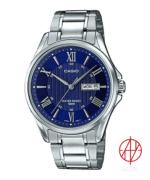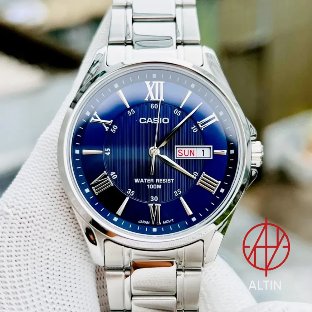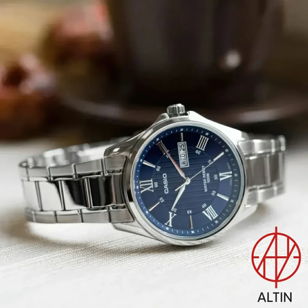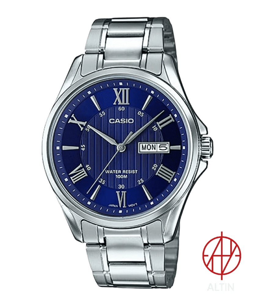ساعت مچی مردانه کاسیو مدل MTP-1384D-2AVDF فراتر از یک ابزار نمایش زمان، یک بیانیه در استایل شماست. نقطه قوت این مدل، صفحه سرمهای (Navy Blue) با الگوی بافتدار مرکز صفحه است که در تضاد با اعداد رومی نقرهای، جلوهای خیرهکننده و بسیار لوکس ایجاد کرده است.